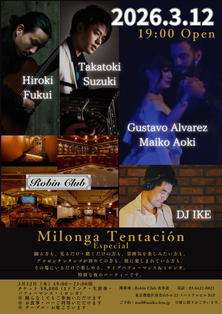 番組で描かれたアルゼンチンタンゴの世界を、今度は同じ空間で体感できる特別な夜を開催します。 『Milonga Tentación Especial』 🗓 2026年3月12日(木)19:00〜23:00 📍 Robin Club 表参道 🎧 DJ IKE 🎶 生演奏 バンドネオン:鈴木崇朗 タンゴギター:福井浩気 💃 パフォーマンス Gustavo Alvarez & 青木舞子 ✔ 踊らない方もご参加いただけます ✔ お席あり・お食事バー利用可 ✔ 初めての方も大歓迎 前売 ¥8,000 (1ドリンク・生演奏・パフォーマンス付) アルゼンチンタンゴを楽しまれている方はフロアで存分に踊り、 手前のラウンジスペースでは お食事やお飲み物を楽しみながら 音楽を聴く・雰囲気を味わうなど、 思い思いにお過ごしいただけます✨ ✨前売予約特典(数量限定) アルゼンチンタンゴクラス優待チケット進呈 アルゼンチンタンゴ初めての方には入門・初級クラス体験チケット進呈! 【ご予約】 mail@maiko.fem.jp またはDMで「3/12参加希望」とお送りください ⸻ ✨Milonga Tentación ミロンガ・テンタシオン – Aeternoon アフタヌーン -✨ 昼下がりにステキなSin Rumboでゆったり楽しむタンゴの時間 Milonga Tentación -Afternoon- ミロンガ・テンタシオン – アフタヌーン - 📅 開催日: 3月3, 31日火曜日 🕐 時間: 13:00〜16:00 📍 会場: アルゼンチン・バー Sin Rumbo 〒160-0008 東京都新宿区四谷三栄町15-3 このミロンガは、レベルを問わず、すべてのダンサーの方を歓迎します。 午後の時間に、落ち着いた雰囲気の中で、タンゴの音楽と抱擁、そして、Sin Rumbo ならではの親密で温かな空間を楽しんでいただけるイベントです。 皆さんと踊り、同じフロアを共有できることを楽しみにしています。 ぜひお気軽に遊びに来てください。 💴 参加費: 3,000円 (ドリンク2杯付き) 🍸 バーのご利用も可能です。 午後の時間を大切にしたい方、 ゆったりとタンゴを楽しみたい方におすすめのミロンガです。 |